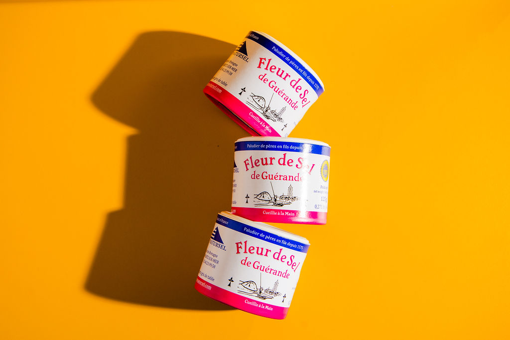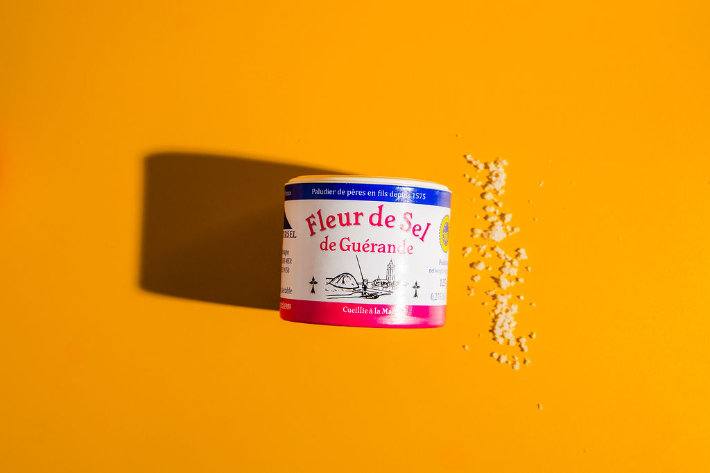 Guérande-i Fleur de Sel Kézzel gyűjtött tengeri só a Guérande-i sólepárló medencékből.
